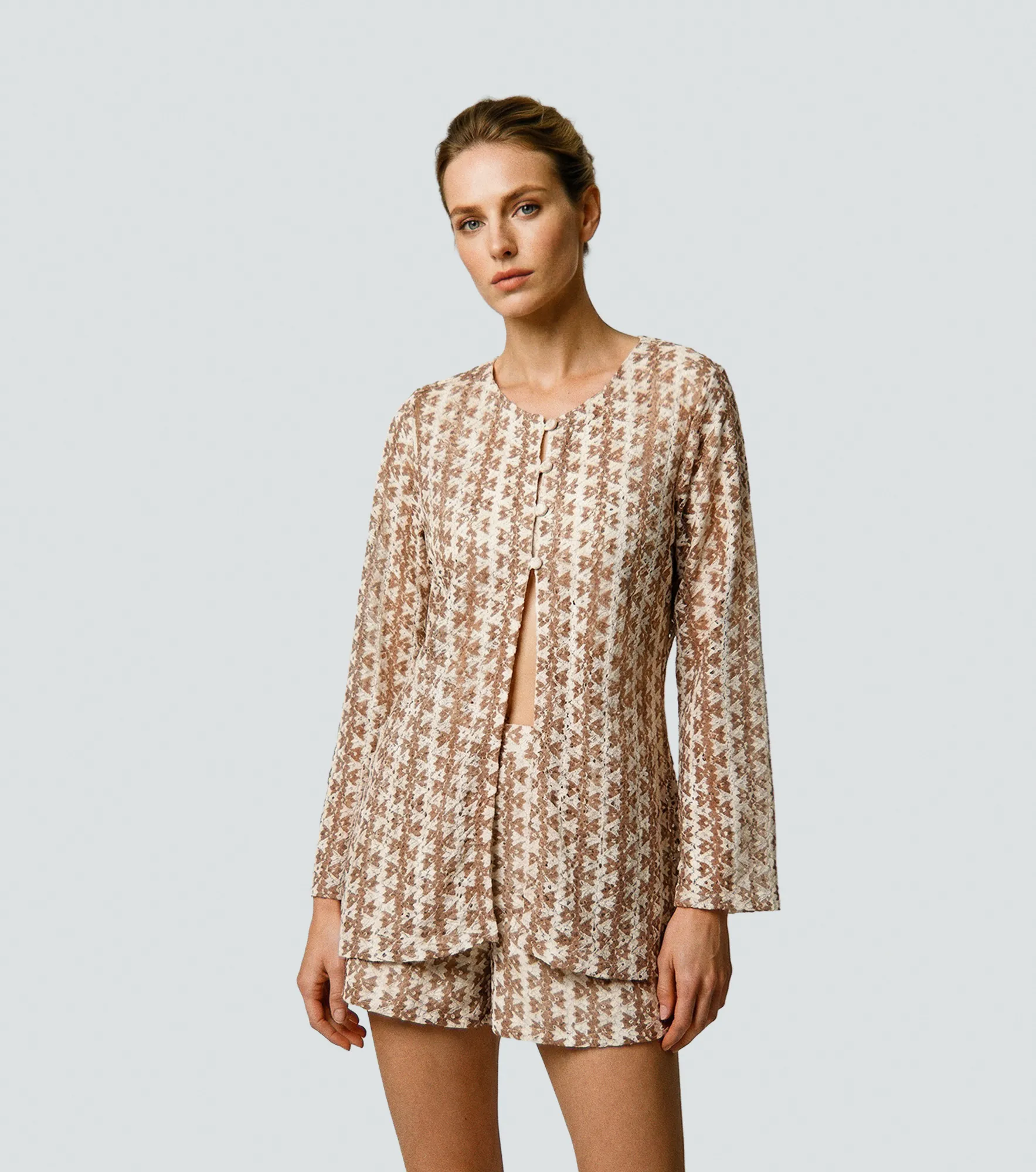 Set de short y blusa de manga larga tejida en tonos café, que combina comodidad y estilo con un toque sofisticado. Su diseño armonioso y femenino lo convierte en un conjunto ideal para un look moderno y lleno de personalidad.